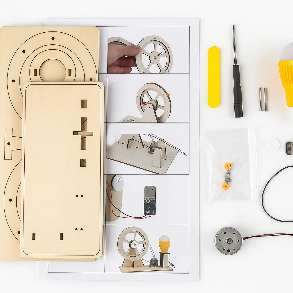 Z tym drewnianym generatorem to proste! Wystarczy zakręcić korbą, a energia z ruchu zamieni się w prawdziwe światło 💡