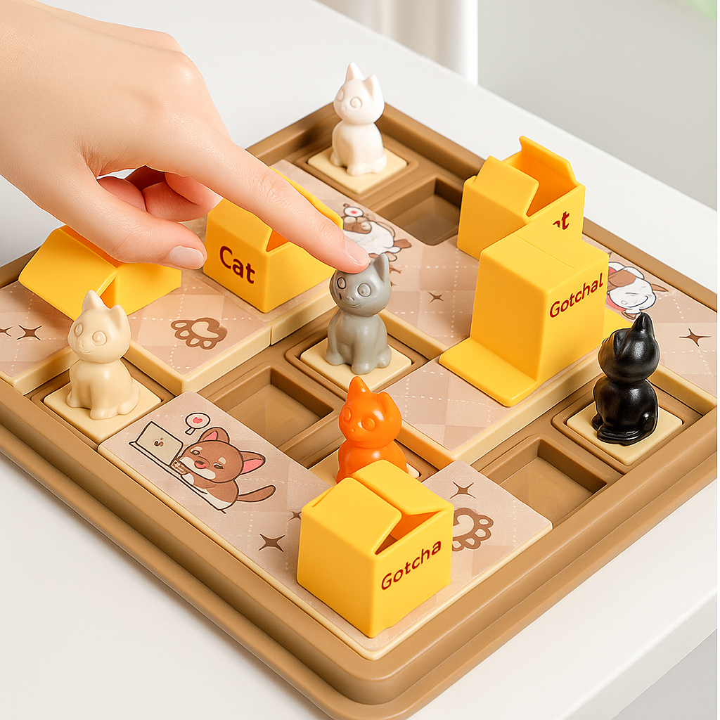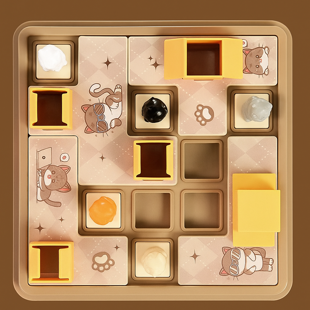 Na planszy znajdują się koty i kartonowe pudełka – trzeba je przesuwać w taki sposób, by każdy kot znalazł się w jednym z pudełek.